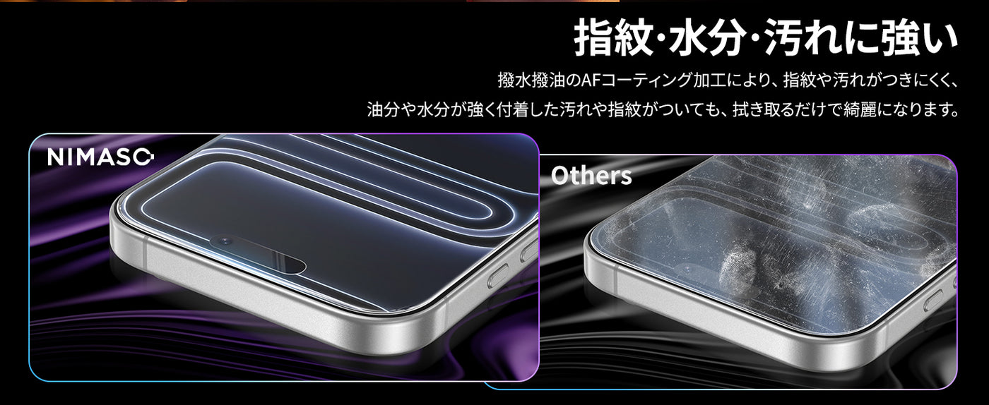 - 【サラサラ手触り・指紋防止】独自のナノエッチング技術に基づいて加工を施しており、一般的な強化ガラスと比べてよりさらさらとした質感で、究極のスムースタッチ感が実現できます。ゲーム好きな方にもおススメのフィルムです。撥水撥油のAF(Anti-Fingerprint)コーディング加工とスムースタッチ加工により、指紋が目立ちにくく、油分や水分が多く含む汚れや指紋がついても、拭き取るだけで綺麗になります。