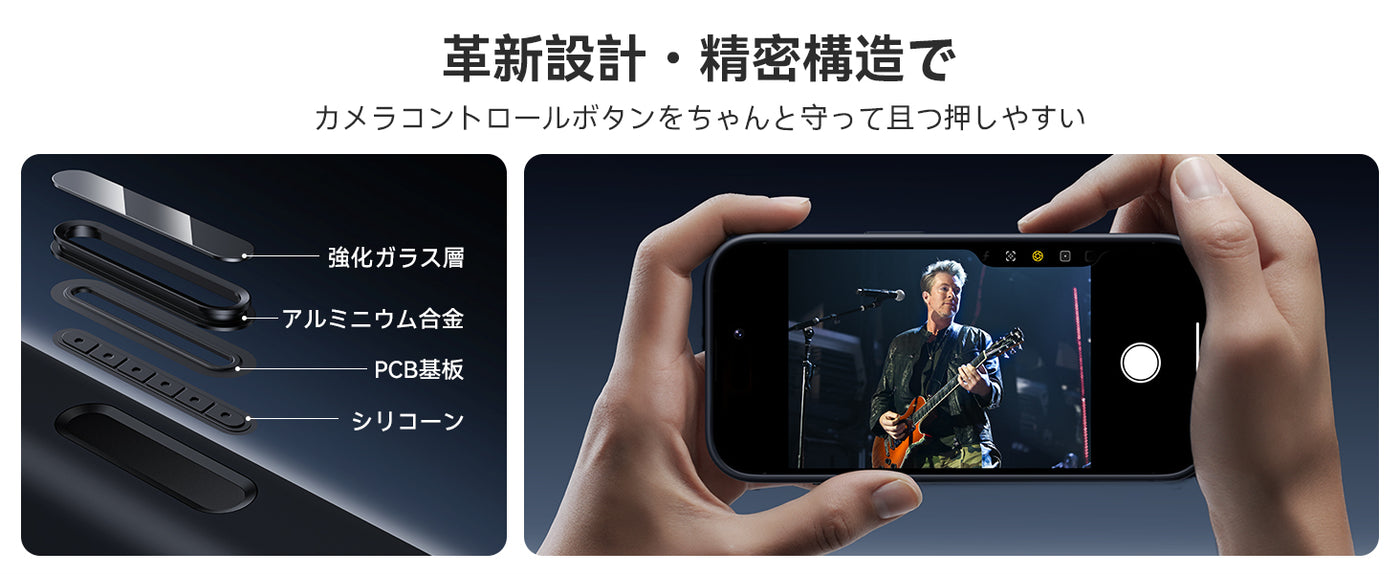 - 【フルアップグレード!カメラボタンまで保護】新たにカメラコントロールボタンを覆う専用保護カバーが追加されました。ケースを装着したままでもスムーズに操作でき、スライドしても押しても、その反応は本体と変わらない精密なタッチレスポンスを実現します。ボタン部分を完全に覆うことで、塵をシャットアウトでき、精密センサーをしっかり保護します。