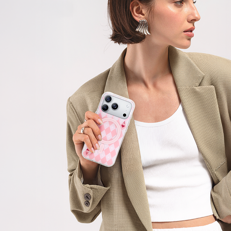 NIMASO iPhone 17/Pro/Pro Max用 ケース MagSafe対応 可愛い ミラー おしゃれ 耐衝撃 ワイヤレス充電対応(ファンシーシリーズ)チェッカー柄 ピンク