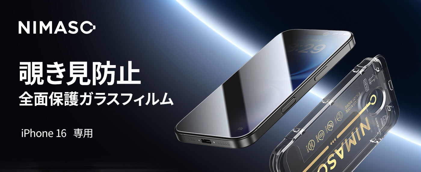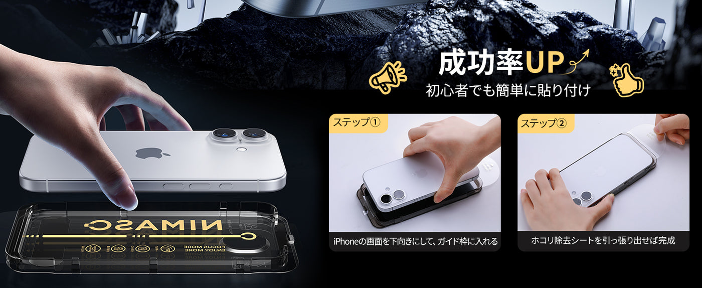- 【2ステップ貼り付け・自動除塵?気泡ゼロ】NIMASO最新設計のガイド枠が登場!たった2つの工程だけで保護フィルムを貼り付けることができます。アイフォン16の画面を下にして、上側をガイド枠に合わせて入れ、ホコリ除去シートを引っ張り出すだけで完成!自動除塵設計だけでなく、フィルム自体のシリコン自己吸着層により、貼り付けるときに気泡が入りにくく、初めての方でも失敗せずに綺麗に貼れます。