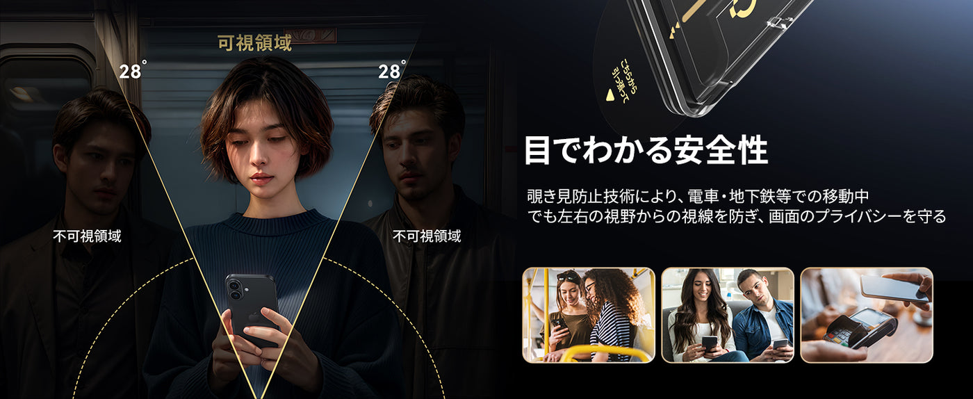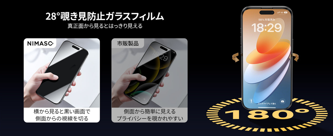 28°覗き見防止|9H硬度|プライバシーを守り|全面保護|失敗なし|指紋防止|気泡ゼロ|耐衝撃|自動除塵|超簡単貼り付け|飛散防止|黒縁取り