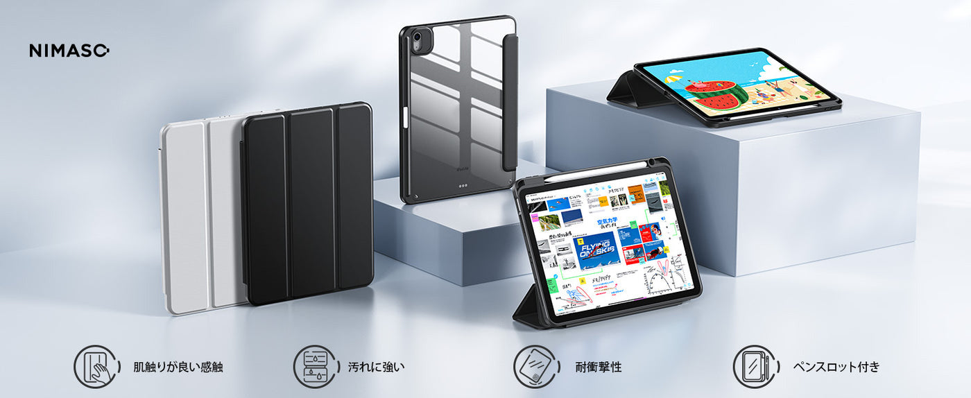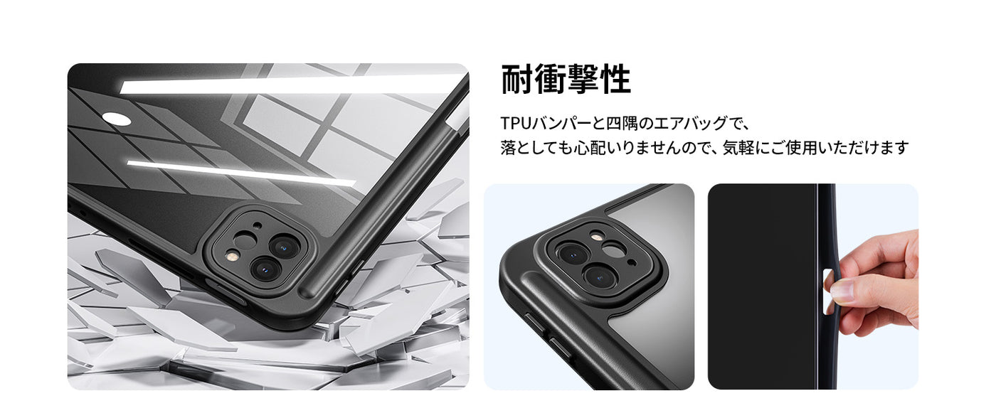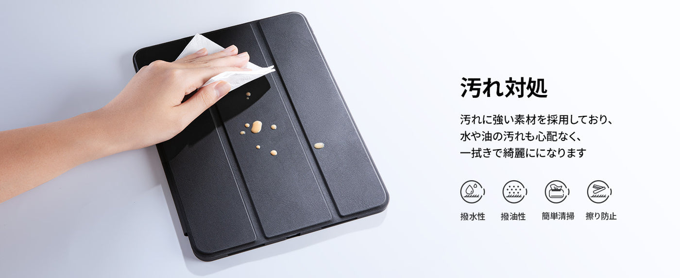 - 【汚れに強い素材を使用】 ケースの表面には軽量で薄いレザー素材を使用しています。背面カバーには透明なアクリル樹脂素材を採用しており、汚れや傷つきを防止するだけでなく、iPad本体の色と美しさもそのままに生かすデザインのケースです。バンパーは柔軟なTPU素材でできており、耐衝撃性に強く、取り付けも簡単にできます。(透明バックカバーには保護シートがついていますので、ご使用前に保護シートを剥がしてください。)