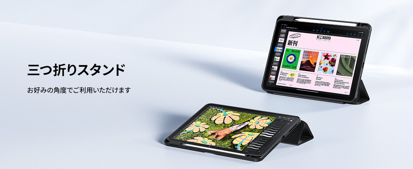 - 【2wayスタンド】三つ折りタイプのスタンドで、動画視聴、読書、勉強、仕事など様々なシーンで便利に使えます。スタンドの角度は2段階で調整可能のため、スタイルに合わせて快適に使用できます。また、スタンドでiPadがしっかりと固定されるので、手で支えなくてもiPadを操作することができ、長時間の使用でも疲れにくいです。