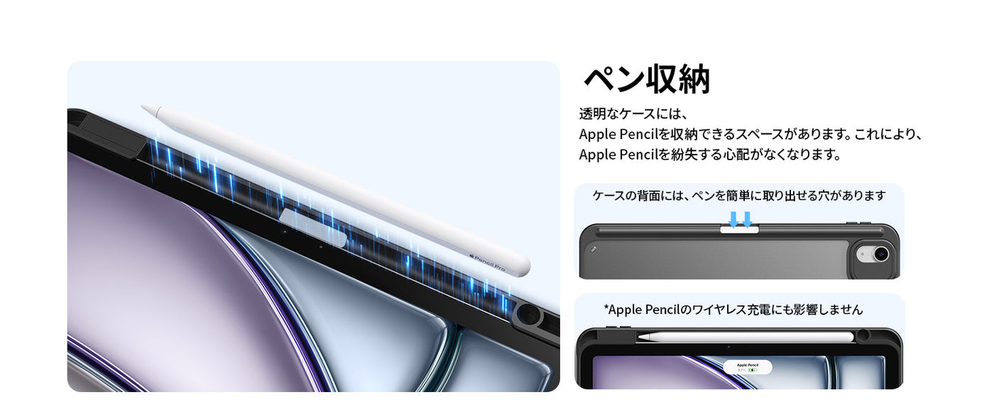 - 【ペンホルダー付き】純正Pencil/Pencil Pro 対応の収納ホルダー付き、ペンシルをなくす心配はありません。端末を保護しながら、Pencilの充電も可能です。オフィス、学校、旅行先など、あらゆるシーンでペンシルを安全かつ効率的に収納できます。