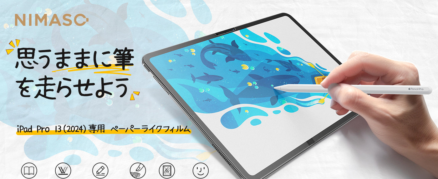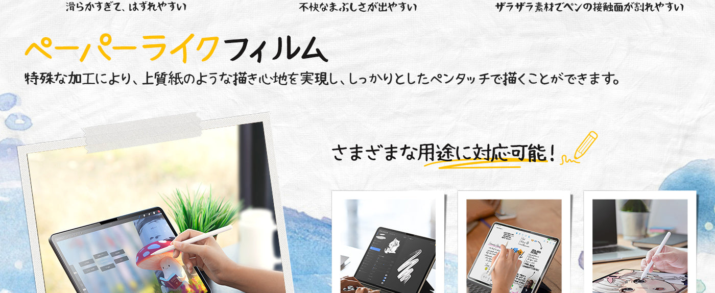 - 【ペン先の摩耗低減・高感度タッチ】紙の描き心地を再現しながらも、ペン先の摩耗や破損は最小限に抑えられるように摩擦を最適化しています。Apple Pencilをより長期間使用することができます。マットな質感と超薄型(0.10㎜)により、指紋防止とスクラッチ防止効果でディスプレイを快適に保ち、指を使ったタッチ操作も違和感なく快適に行えるのが魅力です。