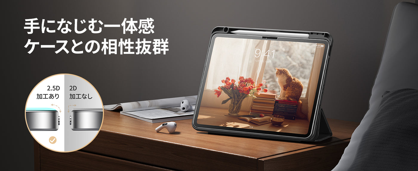 ケースと干渉せず:ipadケースに対応させるため、ガラスフィルムはスクリーンよりやや小さいように設計されています。スクリーンにもっと密着することもできます。ケースとの干渉を気にする必要はありません。