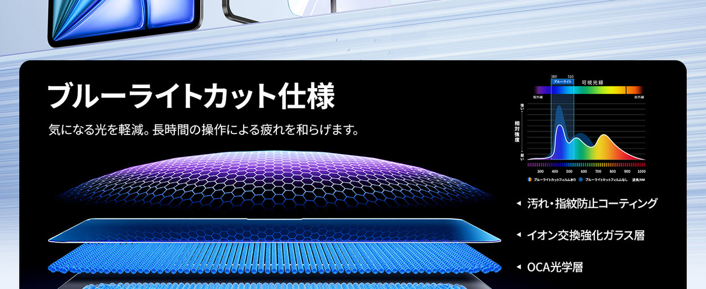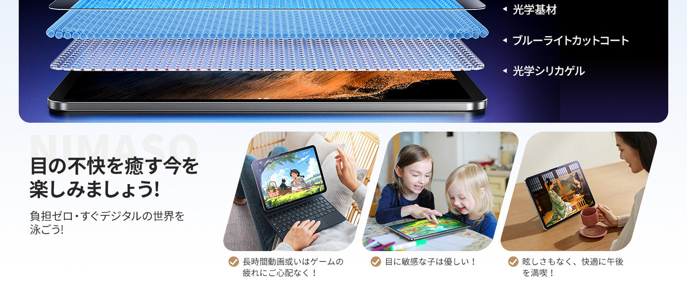 - ブルーライトカット機能:iPad Air 11インチは高輝度、高コントラストのスクリーンに長時間見ていると、目の疲れにつながり、乾燥、ひりひりするなどの不快な症状が現れることがあります。NIMASOの先進ブルーライトカット反射技術によりブルーライトを大幅にカットでき、目に掛かる負担を軽減しましょう。ディスプレイを長時間ご覧になる方におススメです。ブルーライトカット商品ですので、特徴な構造で画面は角度によって、淡い黄色、青紫色に見えます。予めにご了承ください。