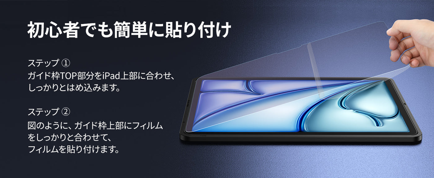 - 専用ガイド枠付き: より貼りやすいように、ipad air 11専用のガイド枠が同梱されています。ガイド枠をしっかりとタブレットにはめ込み、フィルムをガイド枠のインカメのある側にしっかりとあてて、保護シールを剥がしながら置くだけで、シリコン自己吸着層により、綺麗に密着できます。