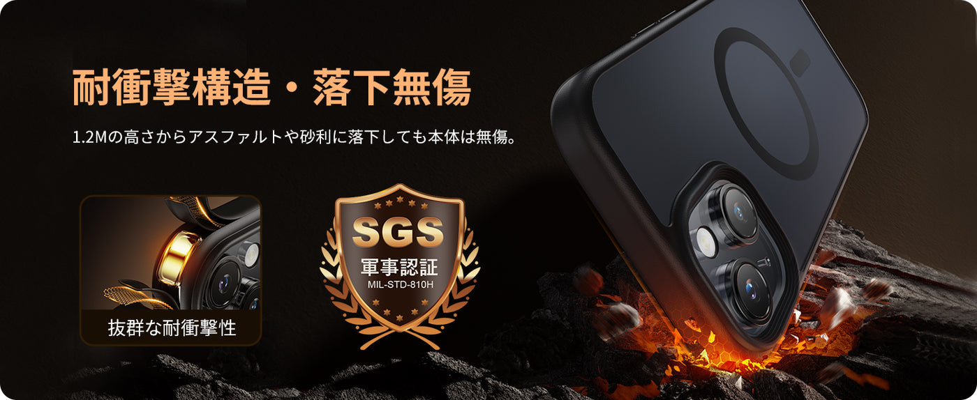- 【米国MIL規格取得・耐衝撃】世界で有名な米国防総省が規定する米軍採用品規格「MIL-STD-810H」認証を取得済みです(認証番号:GZMR220802602301)。1.22mの高さからコンクリートの地面に厚さ5mmの合板を敷き、それぞれ違う角度から合計26回落下させても、本体は無傷です。高い耐衝撃性を誇り、スマホを全方位からしっかりと守ります。