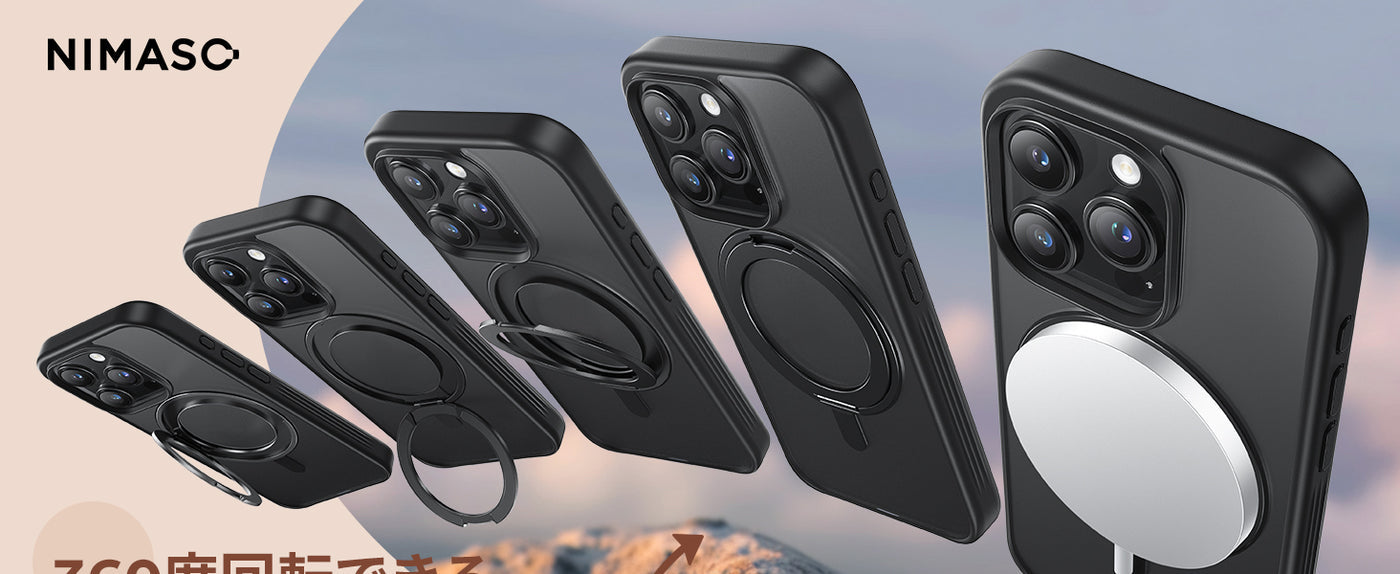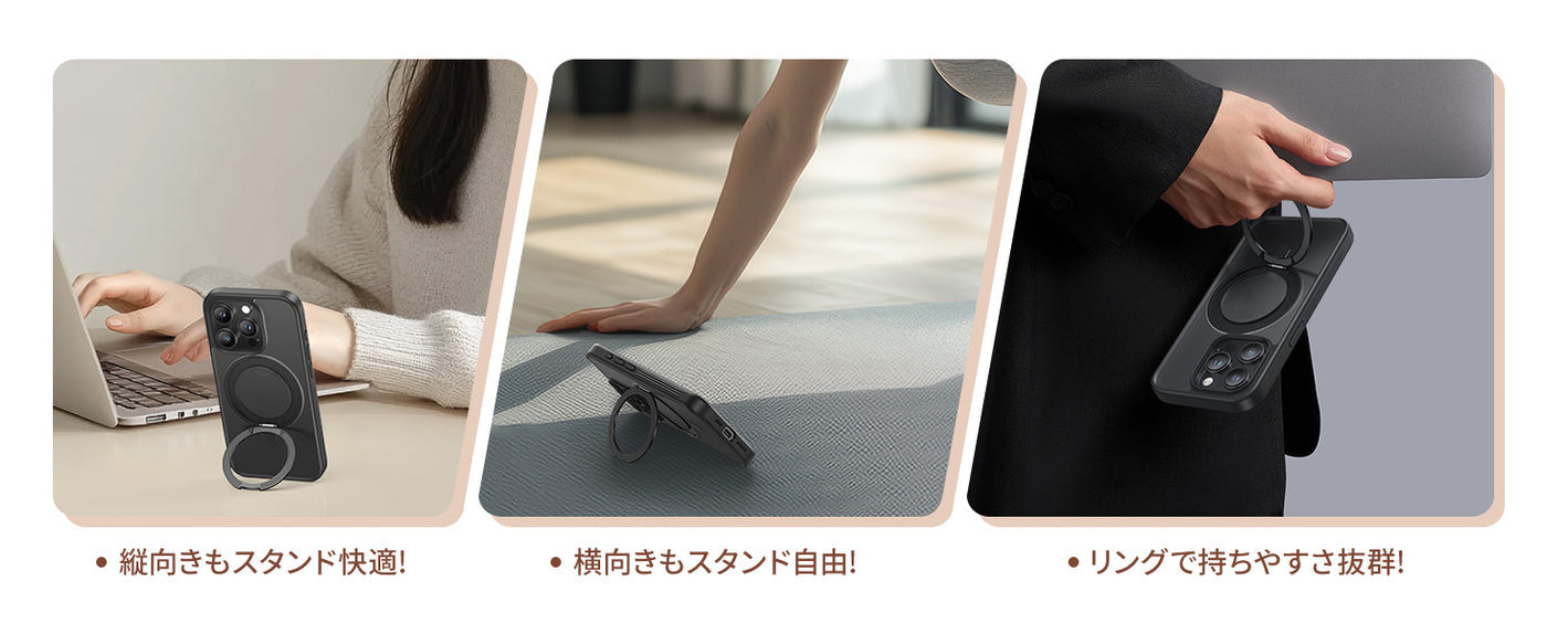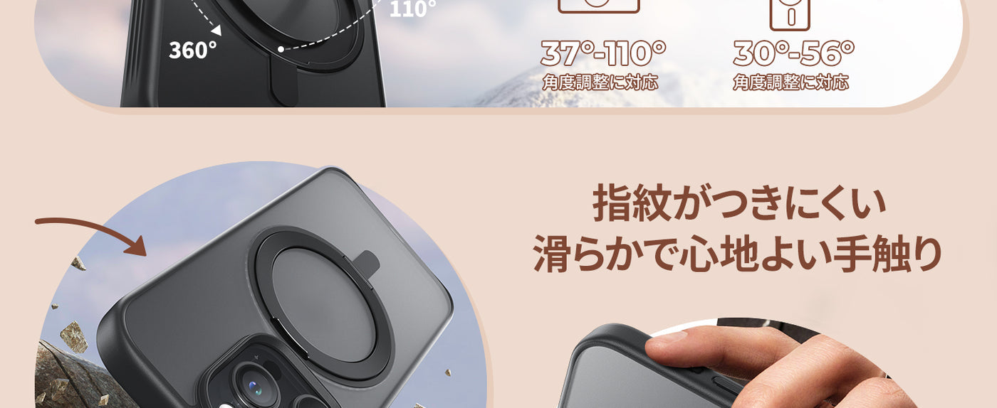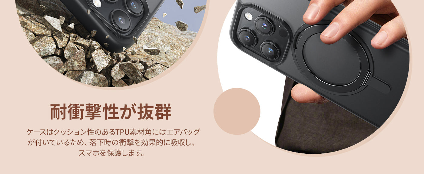 magsafe対応/360°回転スタンド/縦横両対応/指紋防止/透明/米軍規格取得/耐衝撃クーション/バンパー/黄ばみ防止