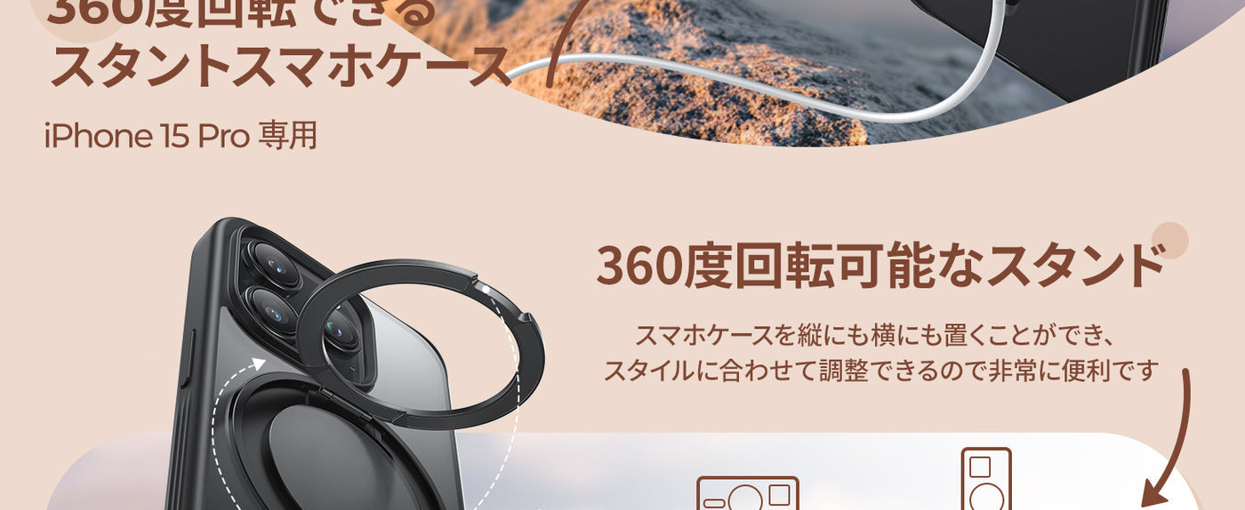 - 【360°回転スタンドケース・縦も横も自由自在】市販の固定式スタンドケースとは異なり、 iPhone 15 Pro対応スタンドケースは360度回転に対応。オンライン会議や友人とビデオ通話をするときは縦置きにして、動画をじっくりと視聴する時は横置きにと、使用目的によって自由に見たい位置に回転することができます。 円形の回転スタンドを回転させると「カチカチ」と快い音が鳴り、ストレス解消グッズに早変わり。