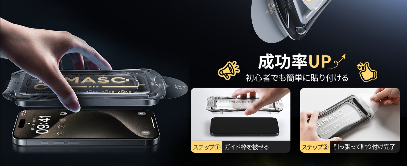 【2ステップOK・自動除塵】NIMASO新型の自動除塵ガイド枠が登場!!!被せる、引っ張る、たった2ステップで初心者でも簡単に貼り付けます。フィルムも自然と吸着する構造になっているため、静電気を利用してスクリーン上のホコリが引き出せ、気泡が入りにくく、完璧な貼り付けが実現でき、貼付け時の失敗が大幅に軽減できます。