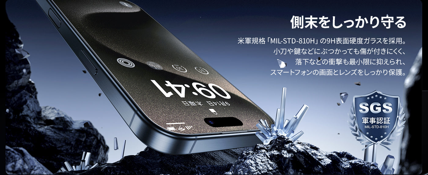 【9H硬度・飛散防止】米軍規格【MIL-STD-810H】に準拠(認証番号:SZXEC23002005001)。9H硬度のガラスを採用。小刀や鍵などの鋭いものにぶつかっても傷が付きにくく、あいふぉん15proをしっかり保護します。飛散防止加工により、万一割れてもガラス破片が飛び散ることなく安心です。