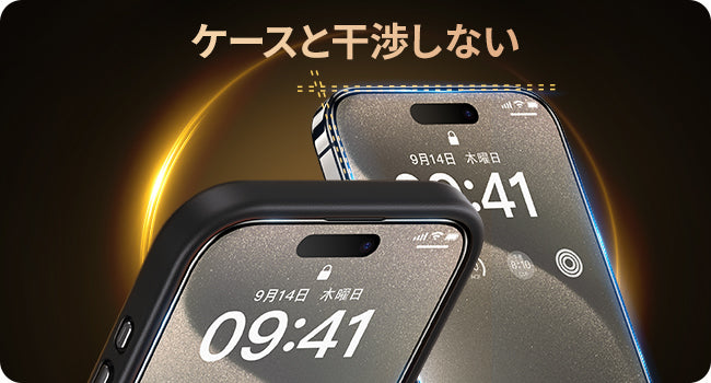 iPhone本体の曲面の縁にスペースを残すデザインを取っており、ほどよいサイズ感で、液晶画面を覆いながら、スマホケースと干渉せず併用できます。