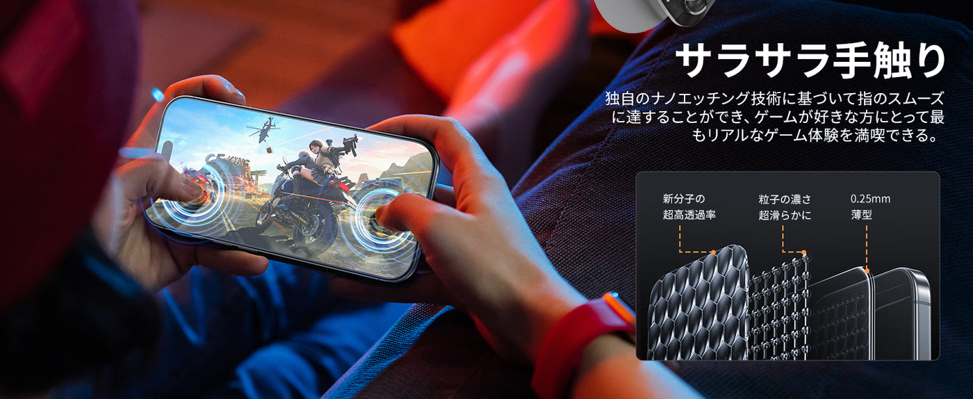 • 【サラサラ手触り・指紋防止】独自のナノエッチング技術に基づいて加工を施しており、一般的な強化ガラスと比べてよりサラサラとした使用感になリ、究極のさらさら感とスムースタッチが完璧に実現できます!ゲームが好きな方にとってリアルなゲーム体験を満喫いただけます。撥水撥油のAF(Anti-Fingerprint)コーディング加工とスムースタッチ加工により、指紋が目立ちにくくなって、油分や水分が強く付着した汚れや指紋がついても、拭き取るだけで綺麗になれます。いつも美しくて清潔にご愛機を守るアンチグレアフィルムです。