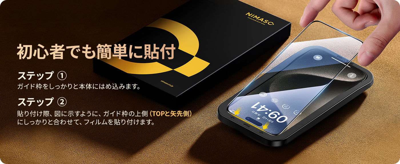 - 【たったの3ステップ・初心者でも綺麗に貼れる】ガイド枠をはめる→上側に合わせて、フィルムを置く→軽く押すだけで自然に吸着。初めての方でも簡単に貼り付けられるよう、専用の貼り付けガイド枠を同梱しています。保護フイルムがズレることなく、だれでも簡単にフィルムを貼ることができます。