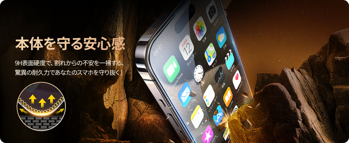 ガイド枠付き,耐衝撃性,9H表面硬度,3D全面保護,飛散防止,高透過率,高感度,自動吸着,気泡ゼロ,指紋防止,ケースと干渉しない
