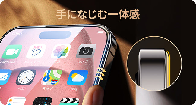 強化ガラス素材、全面保護、9H 表面硬度 、擦り傷防止、衝撃吸収、 撮影影響なし 、一体感抜群 、貼り付け簡単