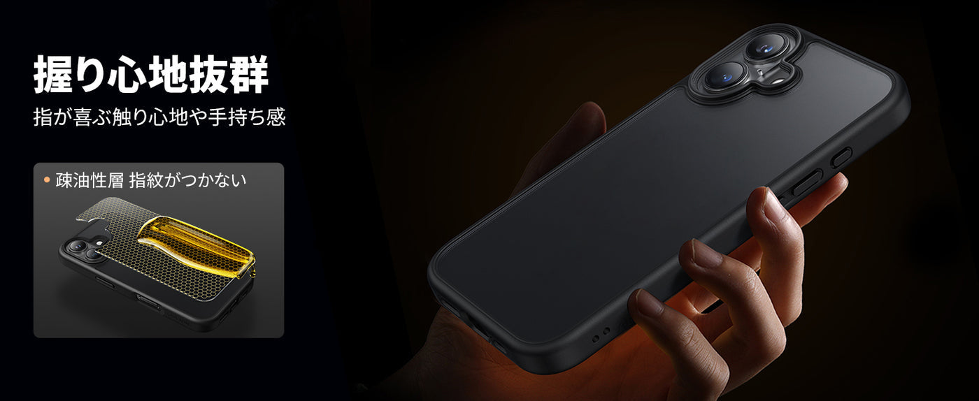• 【半透明・マットな仕上げ】背面のポリカーボネートは、耐久性や耐摩耗性に優れ、マットな質感でサラサラして触り心地がすごく良いです。表面には指紋防止ナノオコーティングを施しており、指紋つく心配はありません。特に、背面は半透明で、高級感と神秘感が溢れ、iPhone16用 ケースのかっこいいリンゴロゴが見えます。