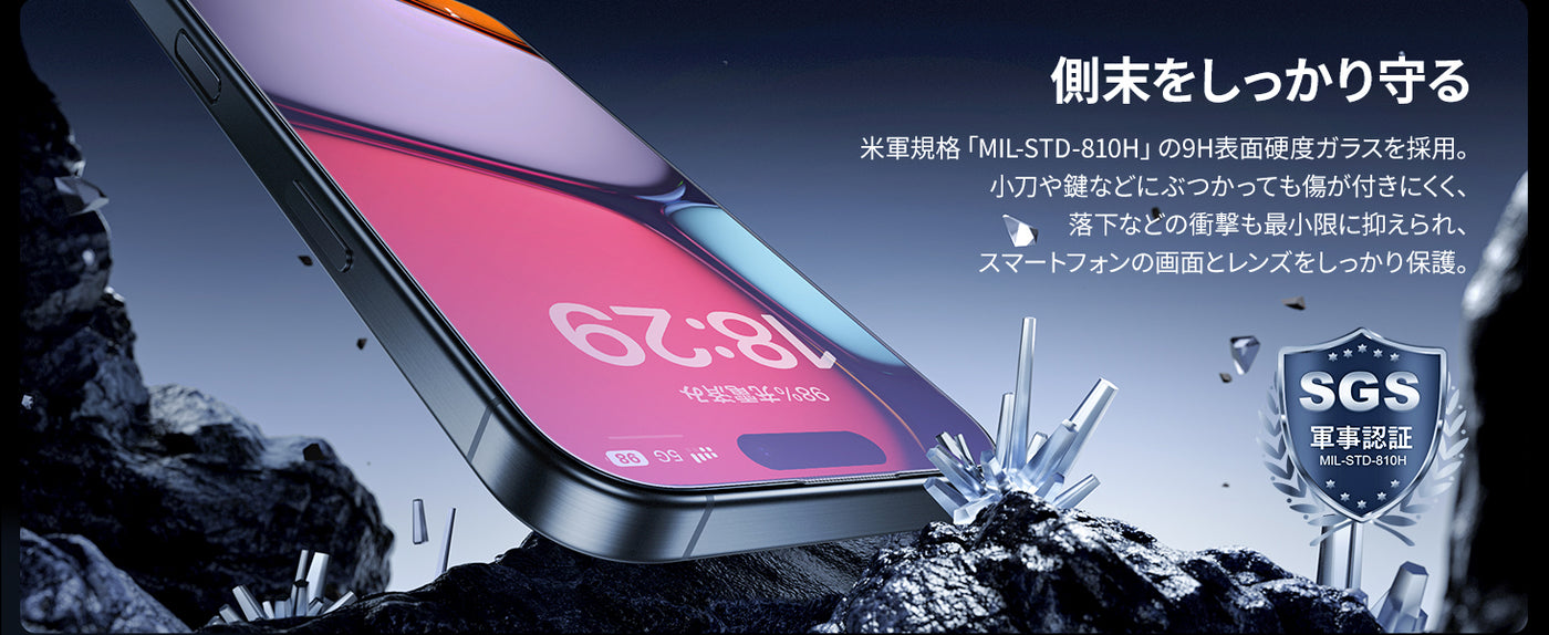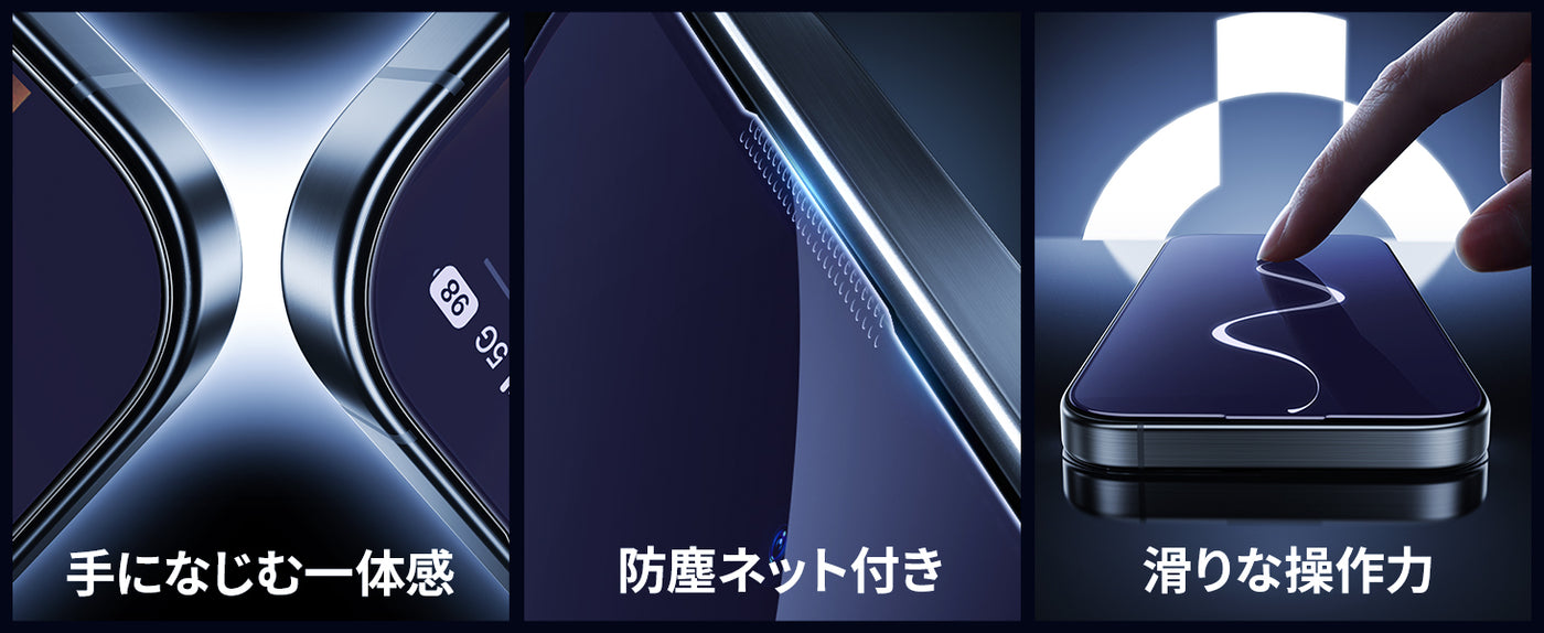 9H硬度|ガイド枠付き|ブルーライトカット|撥水撥油|目の疲れ軽減|耐衝撃|自動吸着|自動除塵|貼付け簡単