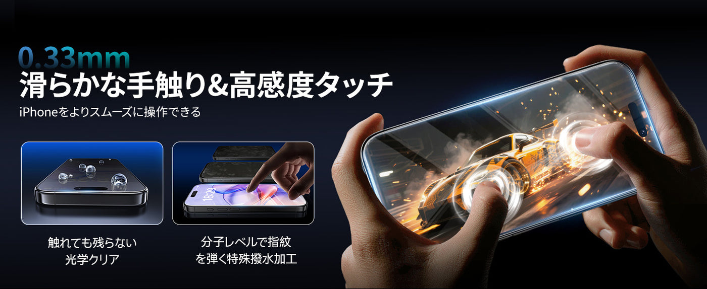- 【指紋防止・滑らかな触り心地】本製品は撥水撥油のAF(Anti-Fingerprint)コーティング加工とスムースタッチ加工により、指紋や汚れがつきにくく、油分や水分が強く付着した汚れや指紋がついても、拭き取るだけで綺麗になります。また、手触りも滑らかで、毎日の動画視聴や仕事、勉強、ゲームなどのあらゆるシーンでも、常に美しいアイホン17の画面をお楽しみいただけます。