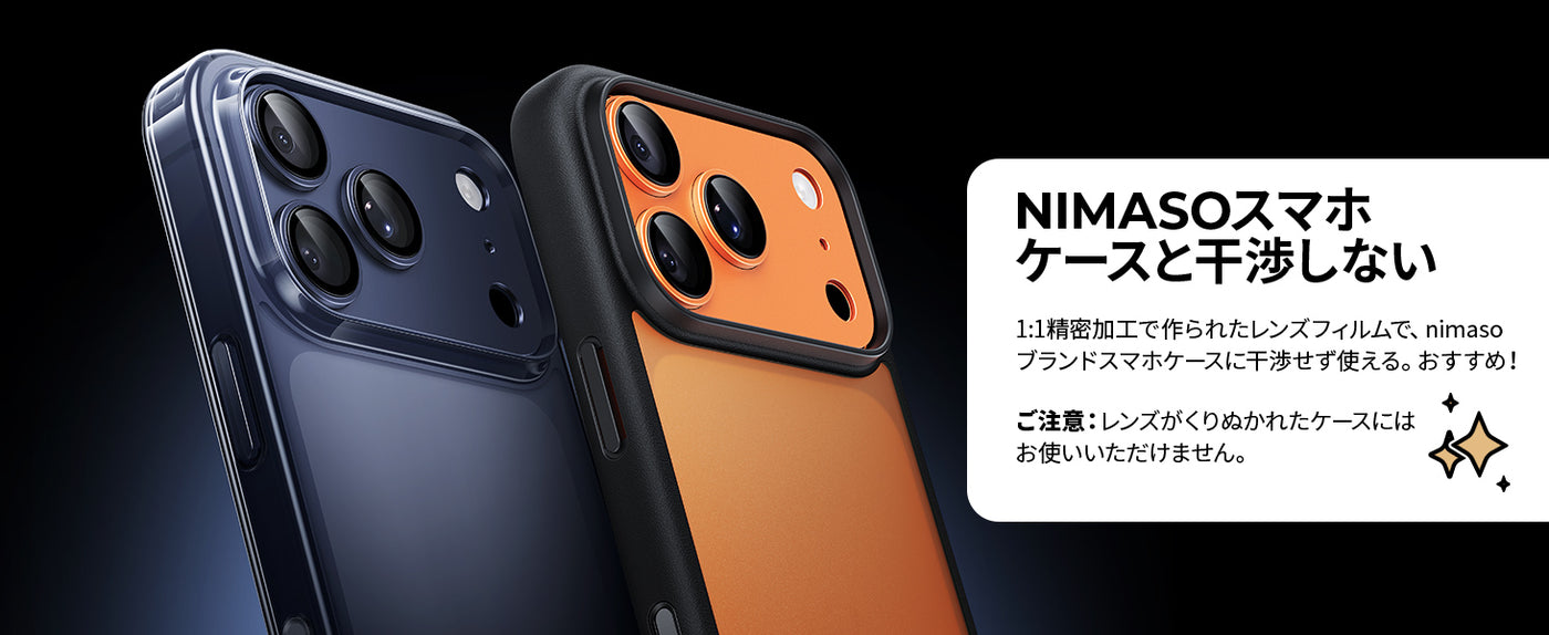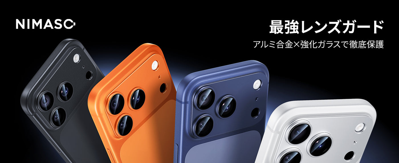NIMASO iPhone 17/17 Pro/Pro Max/Air用 カメラフィルム アルミ合金+9H強化ガラス 全面保護 黒縁取り 耐衝撃 ガイド枠付き