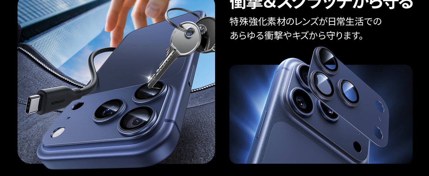 - 【アルミ合金製+強化ガラス・全面保護】レンズ部分は強化ガラス製で、9Hの超高硬度があり、レンズ全体を密着して保護します。鍵などの硬く尖ったものでもレンズが傷つかず、iPhone17をバッグやポケットの中に入れても安心です。レンズ周囲はアルミ合金製で衝撃に強く、飛散や割れをしっかり防止します。レンズ部周囲に0.18mmの段差をつけるデザィンが採用されており、カメラに直接衝撃が伝わりにくい構造です。
