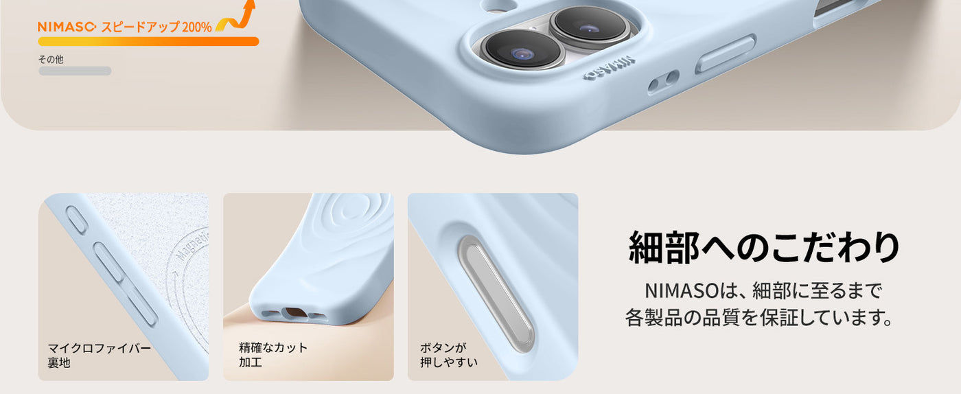 - 【全面保護】ケースのコーナーには強化クッションを採用し、スマホの画面より1.5mm、カメラレンズ部分より1mm高くするこで、落下時の衝撃から端末を守ります。内部には超細繊維の毛生地を採用し、スマホ背面との接触面を保護し、微細な塵や砂粒によるキズを防ぎます。また、アイフォン17ケース外側には耐摩耗コーティングを施し、長期間使用してもデザインが剥がれにくい仕様となっております。