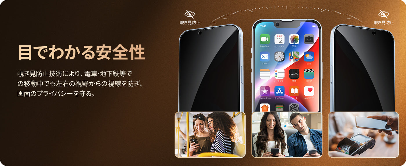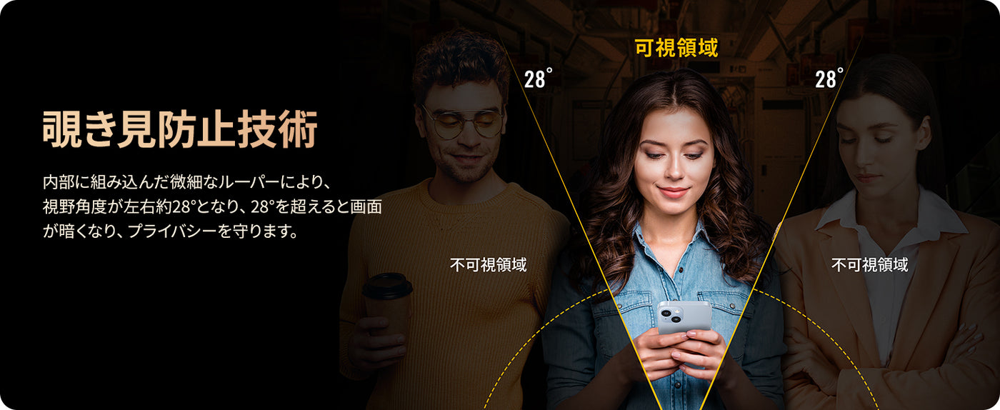 - 【覗き見防止仕様】覗き見防止技術により、左右の視野からの視線を防ぎ、画面のプライバシーを守ります。例えば、電車やバスの中でメッセージを見ていたら、隣の人に覗かれていたという心配がなく、LINEやメール操作の際も安心です。また、本製品は斜めから見るとブラインドルーバーにより画面が真っ黒になりますが、真正面から見ると高透過率ではっきり見ることが出来ます。