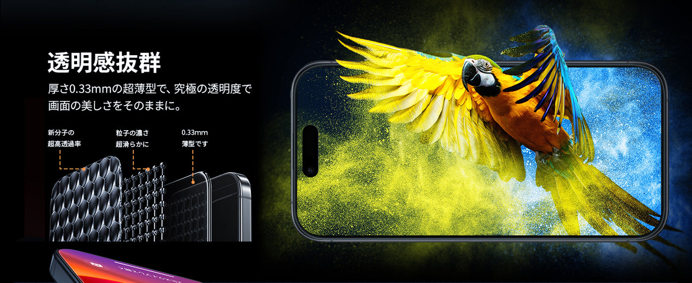 - 【高感度タッチ・99%透明度】厚みは約0.33mm。薄いため装着後の違和も少なく、タッチ感度も従来より向上しました。透明度が高く、画面そのままの美しさを保ちます。さらにガラスフィルムを貼っていないかのような触り心地です。