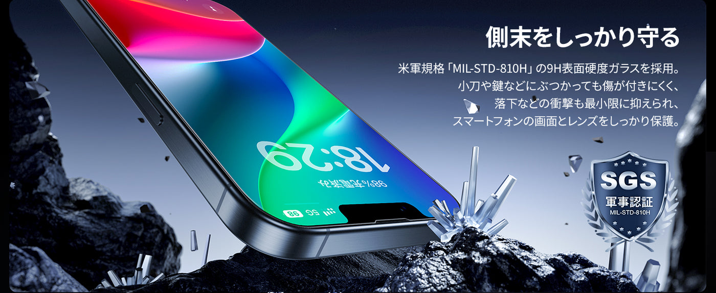 9H硬度|全面保護|失敗なし|指紋防止|気泡ゼロ|耐衝撃|自動除塵|超簡単貼り付け|飛散防止|黒縁取り