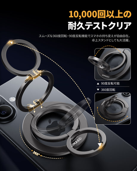 NIMASO スマホリング マグネット式 スマホ落下防止 角度調整可能 金属リング付き iPhone17/16/15/12/11シリーズ、Androidなど全機種対応(ブラック/シルバー)