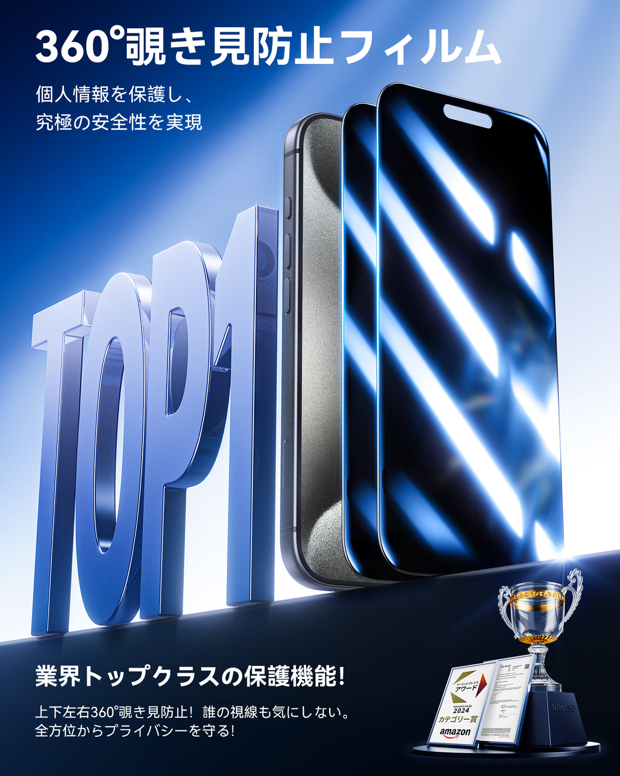 全方向からの覗き見を防止できるのiPhone 15 フィルム