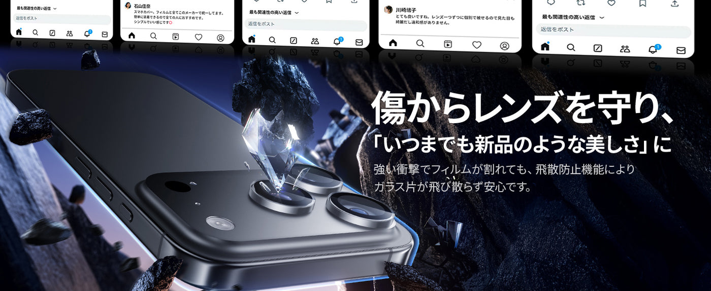 - 【日本製強化ガラスを使用】 日本国内最大手のガラスメーカー、旭硝子製の強化ガラスを使用。硬度は9Hの超高硬度のため、ナイフや鍵などの尖ったものでも簡単には傷がつきません。カメラレンズ全面を守り、バッグやポケットの中で付いてしまう引っかき傷に対して高い耐性を持ちます。
