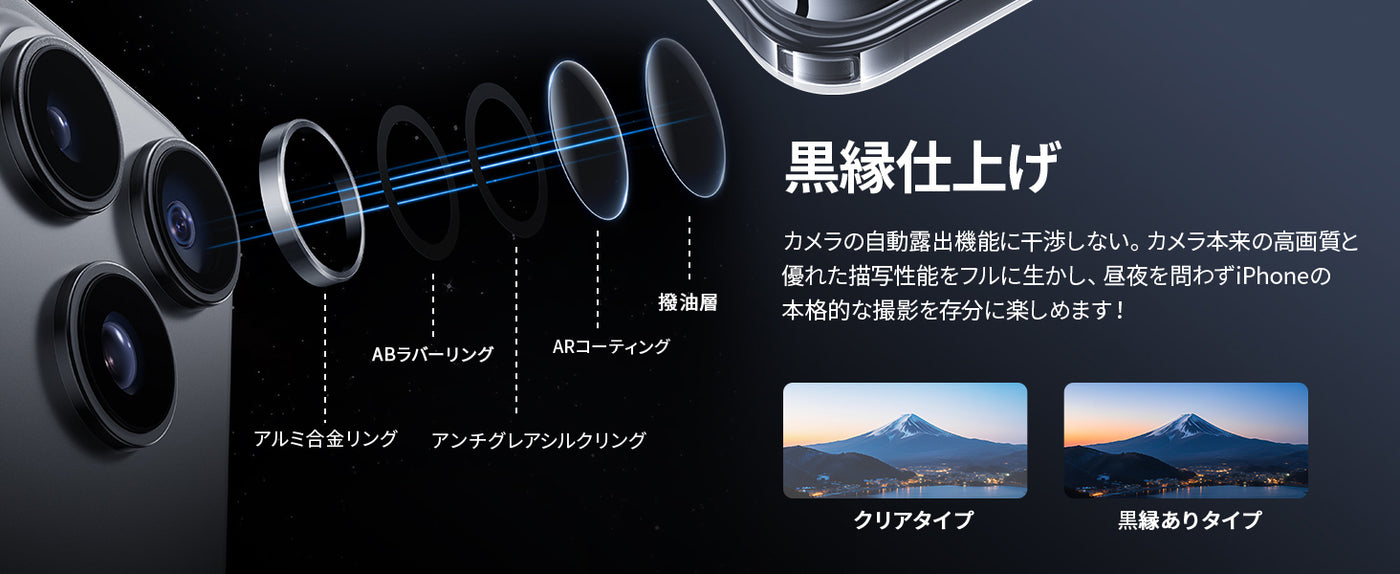 - 【黒縁取り仕上げ仕様】 本製品は露出オーバー防止のために、カメラレンズのガラスカバーに黒縁取りをした設計を使用します。カメラの自動露出機能を干渉せず、明るい被写体でも暗い被写体でも適正な明るさの写真を撮影することができます。※ご注意:本製品は露出オーバーを完全に防ぐものではありません。