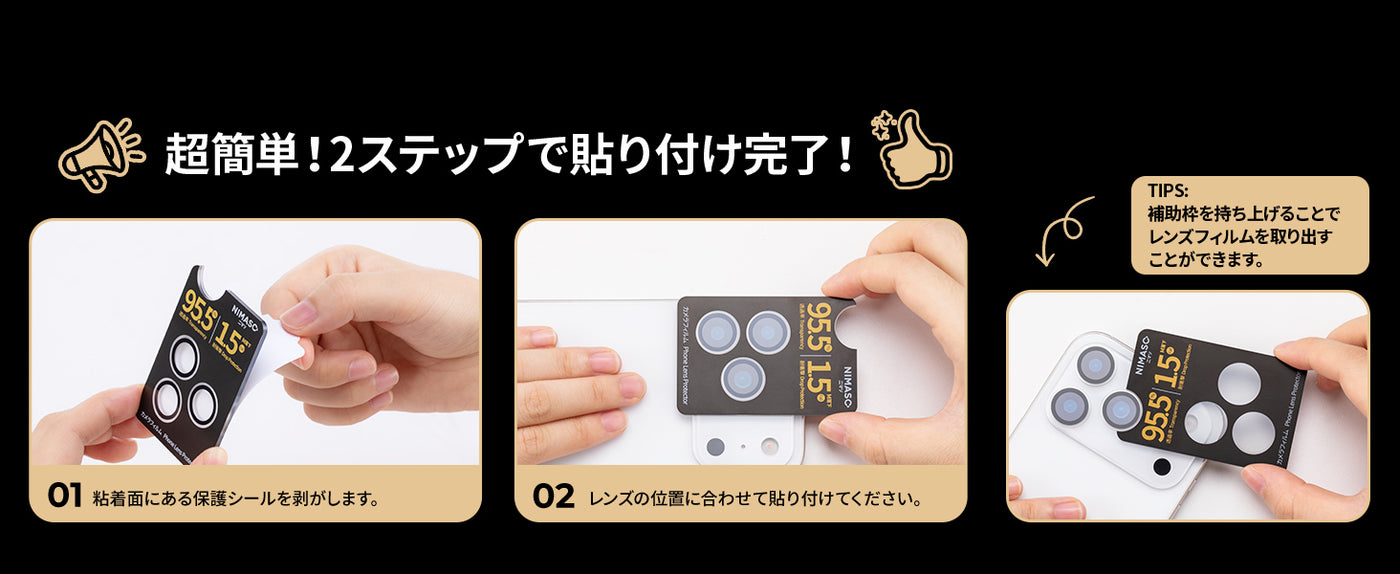 - 【貼り付け簡単】 補助パットがありますので、一気に3枚のレンズフィルムを貼ることができます。位置に合わせて軽く置くだけで気泡が入らず簡単に貼ることができます。