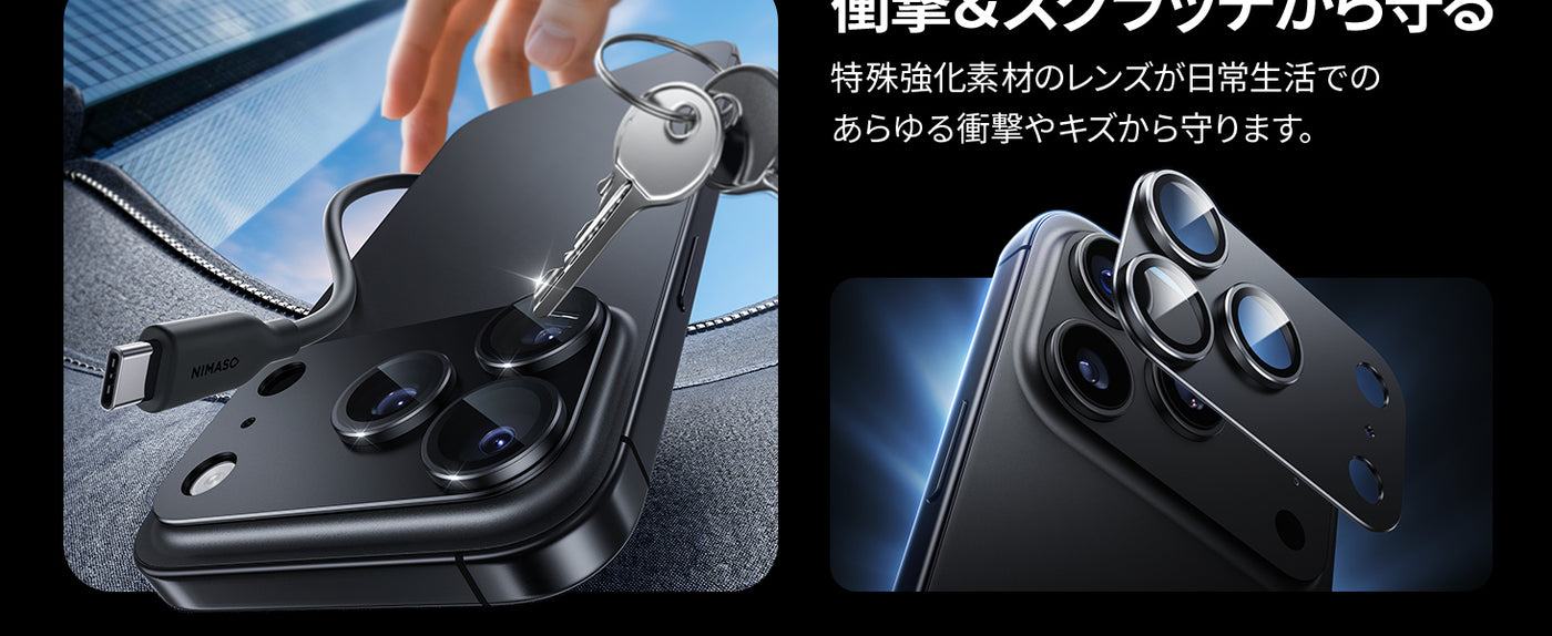 - 【アルミ合金製+強化ガラス・全面保護】レンズ部分は強化ガラス製で、9Hの超高硬度があり、レンズ全体を密着して保護します。鍵などの硬く尖ったものでもレンズが傷つかず、いPhone17/いPhone16/いPhone16Plusをバッグやポケットの中に入れても安心です。レンズ周囲はアルミ合金製で衝撃に強く、飛散や割れをしっかり防止します。レンズ部周囲に0.18mmの段差をつけるデザィンが採用されており、カメラに直接衝撃が伝わりにくい構造です。