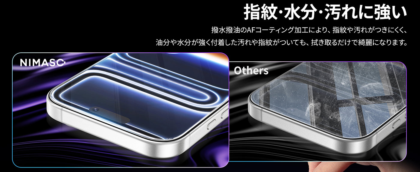 - 【指紋防止・高感度タッチ】本製品は撥水撥油のAFコーディング加工とスムーズタッチ加工により、指紋や汚れがつきにくく、付着した汚れも拭き取るだけで綺麗になります。また、疎油層と組み合わさることでタッチ感度も変わりません。ゲームもタイピングも滑らかで、あいふぉん17の美しい画面とスム一ズな操作をお楽しみいただけます。