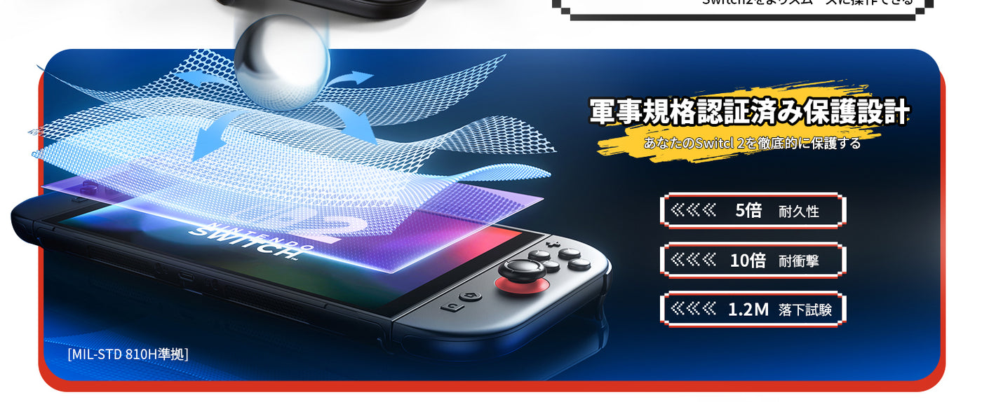 • 【軍用規格レベルの強度・飛散防止】米軍規格MIL-STD-810H認証(SZXEC23002005001)を取得した9H硬度ガラスを採用、鞄やポケットのなかで、鍵などの鋭いものにぶつかっても傷が付きにくく、スイッチ2をしっかり保護します。飛散防止加工により、万一割れてもガラス破片が飛び散ることなく安心です。