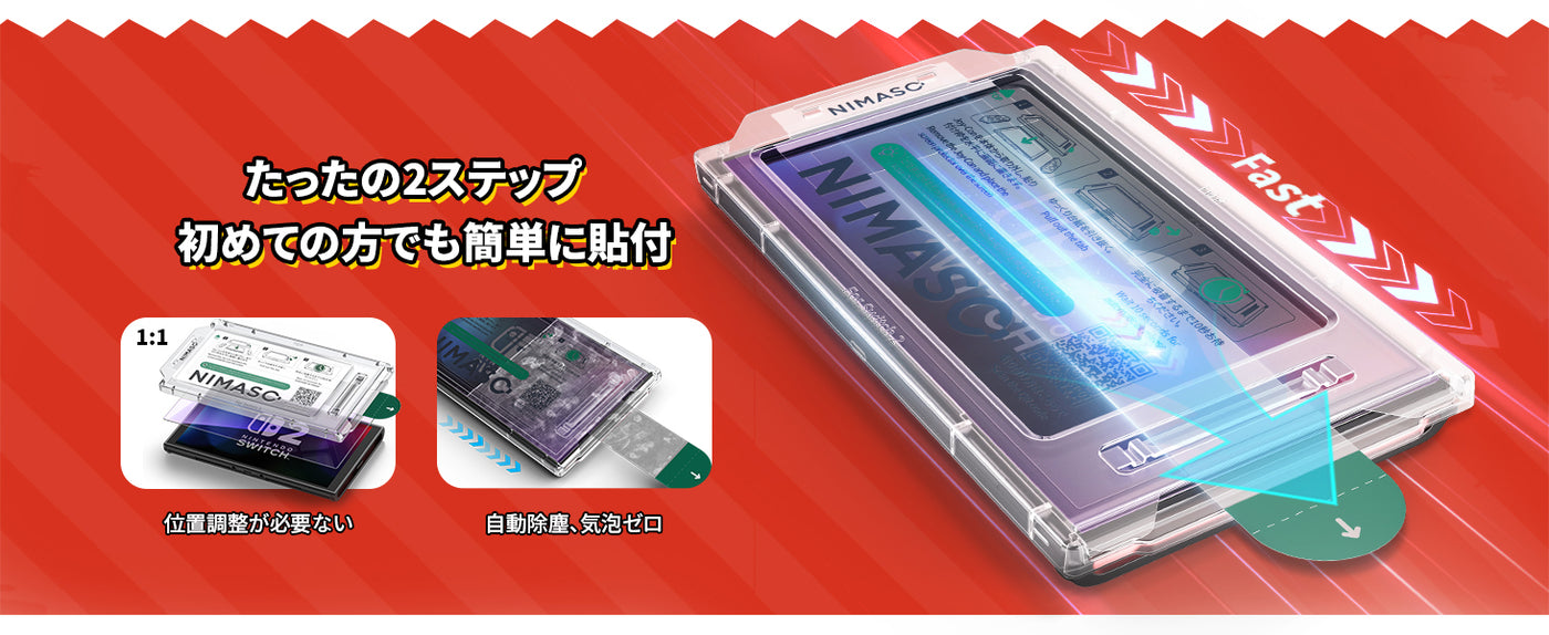 • 【わずか3秒で貼りつけ完了!初心者の方でも簡単・キレイに貼り付け】NIMASO独自の自動除塵ガイド枠が登場!!!被せる、引っ張る、たった2ステップで驚くほど簡単に貼り付け作業ができます!さらに、ホコリやゴミを自動的に吸着除去してくれるので、貼り付け時の失敗が大幅に軽減します。初めての方でもストレスなく、キレイに貼れるのが特長です。もう気泡やズレに悩まされることはありません!貼り直しの手間もなく、高い成功率を実現。