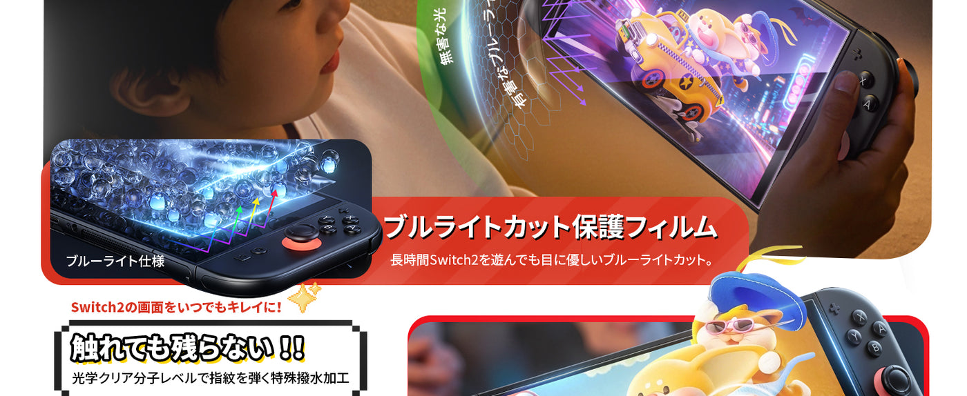 • 【ブルーライトカット・目の疲れ軽減】ブルーライトを大幅にカットすることで、目の疲労を緩和します。長時間Switch2の画面を見たり、ゲームをする方におススメです。(ご注意:ブルーライトカット加工は、使用角度や環境によって、淡い黄色や薄い紫色に見える場合があります。予めご了承下さい。)