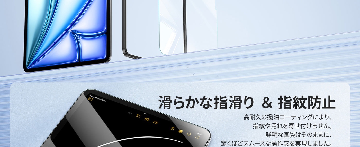 - 指紋防止:iPad air 11インチ フィルムは撥水撥油のAF(Anti-Fingerprint)コーディング加工とスムースタッチ加工により、指紋や汚れがつきにくく、油分や水分が強く付着した汚れや指紋がついても、拭き取るだけで綺麗になれます。また、使用時の手触りも滑らかで、毎日のドラマ視聴やオフィス仕事、ゲームなどの邪魔になりません。常に美しい画面をお楽しみいただけます。