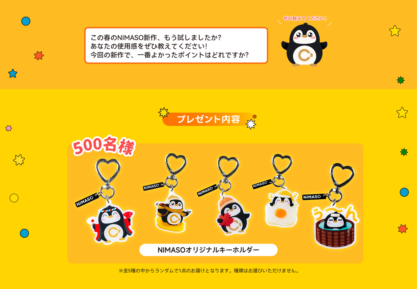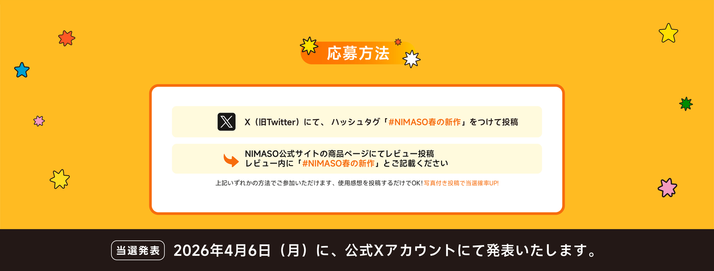 ① X(旧Twitter)にて、ハッシュタグ「#NIMASO春の新作」をつけて投稿