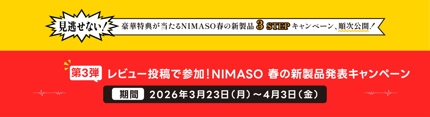 ② NIMASO公式サイトの商品ページにてレビュー投稿、レビュー内に「NIMASO春の新作」とご記載ください