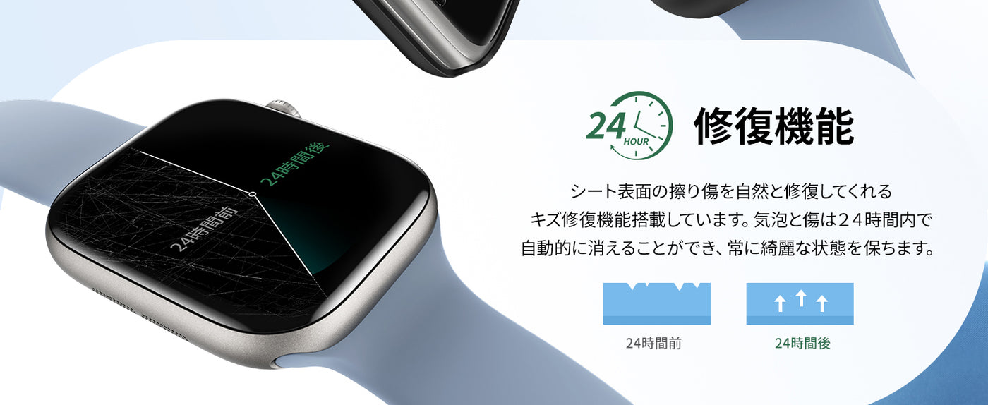 - 【汚れ防止&指紋防止】撥水撥油コーティングを施しており、指紋や汚れが付きにくくなっています。万が一汚れが付いた場合でも、簡単に拭き取ることができ、滑らかな状態を保つ事ができます。ご注意:長時間水に浸けるとコーティングが剥離する恐れがございます。また、フィルムは優れた伸縮性を備えており、細かいキズや小さな気泡であれば24時間程度で自己修復を行い自然に消えます。 ※1長時間水に浸けるとコーティングが剥離する恐れがございます。 ※2全てのキズに対して修復をする保証をするものでは御座いません。キズの深さによっては自己修復出来ない場合も御座います。