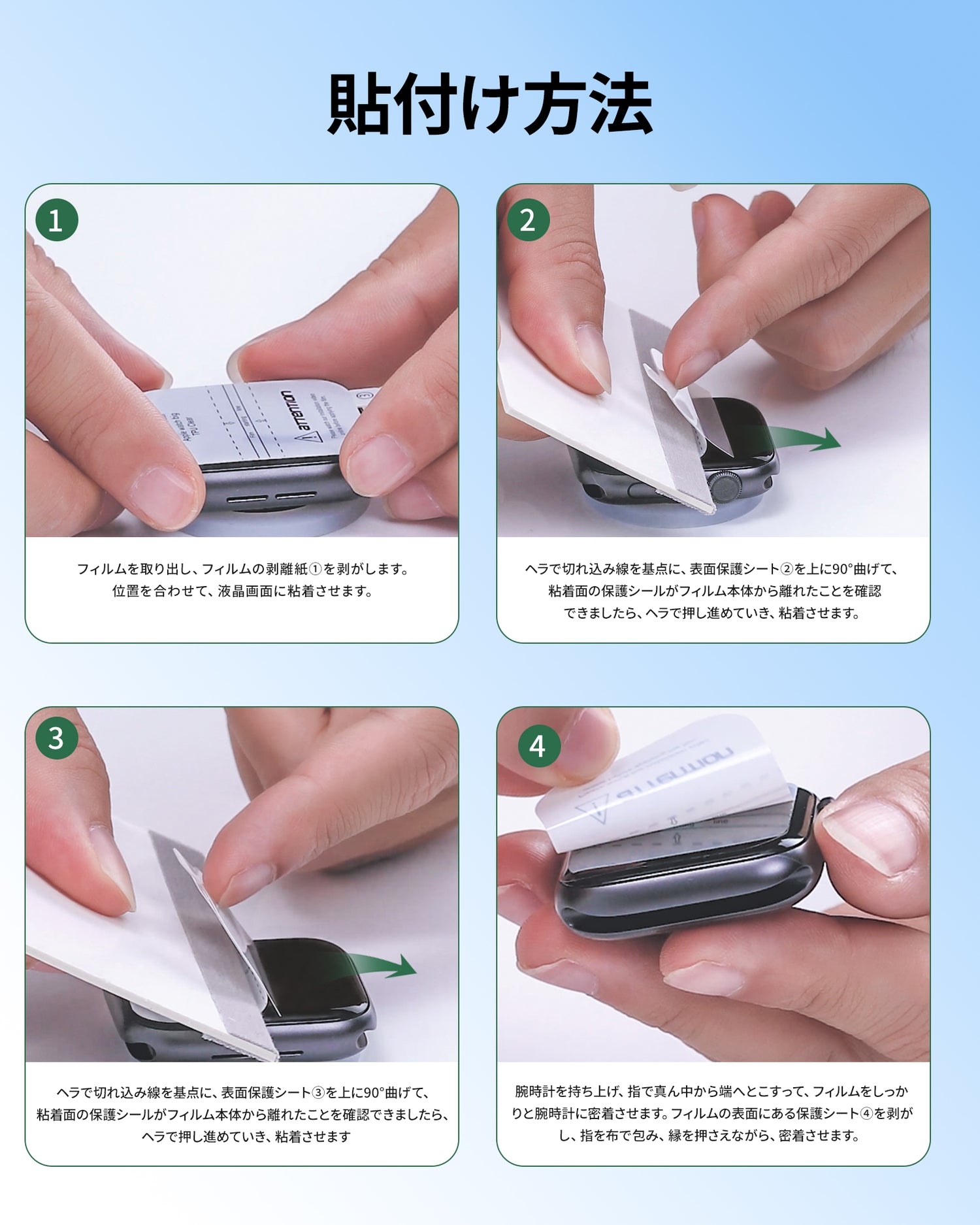 - 【装着簡単】ケースはApple Watch 専用のピッタリ設計で、バンドを外さずに本体にはめ込むだけで、手軽に装着可能です。フィルムにはステップ①~④の数字が記載されておりますので、取扱説明書見ながら簡単に貼り付けすることが出来ます。ご注意:環境保護の観点から、ファイバークロスは2枚のみの同梱となります。クロスは繰り返しの使用が可能です。