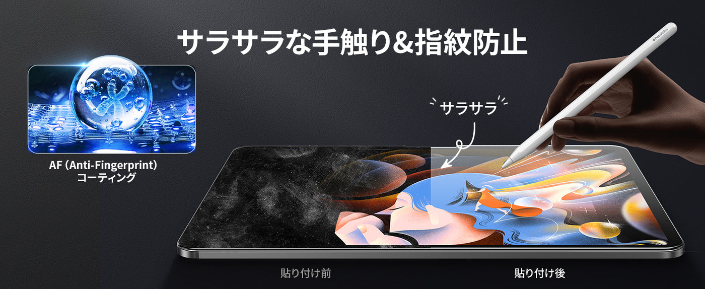 - 指紋防止:本製品は撥水撥油のAF(Anti-Fingerprint)コーディング加工とスムースタッチ加工により、指紋や汚れがつきにくく、油分や水分が強く付着した汚れや指紋がついても、拭き取るだけで綺麗になれます。また、使用時の手触りも滑らかで、毎日のドラマ視聴やオフィス仕事、ゲームなどの邪魔になりません。常に美しい画面をお楽しみいただけます。