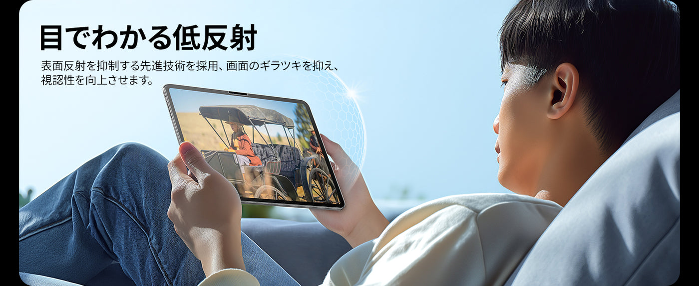 - アンチグレア:iPad air13表面にアンチグレア加工が施されており、光を乱反射させ、ギラツキを抑え、画面の映り込みを抑えます。強い光から目を守ります。一方、アンチグレアの特性上、画質が少々落ちることもあります。*今回のフィルム素材は従来のアンチグレアフィルムよりも画面が見やすく認識しやすくなり、目の負担を軽減し、疲れにくいです。
