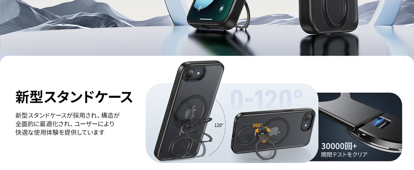 • 【360°回転スタンド · 向きも角度も自由自在】多機能スタンドとリング一体型の斬新なデザインです。スタンドを閉じれば背面はスマートに。どの向きでも安定して支えることができ、横置きの場合は30-113°、縦置きの場合は24-97°に角度調整が可能。スタンドを開くだけで好きな角度でスマホを楽しめます。スタンド部分を指にかければスマホリングとしても使えます。※リング部分を持ったまま強い力を与えないようにご注意ください。