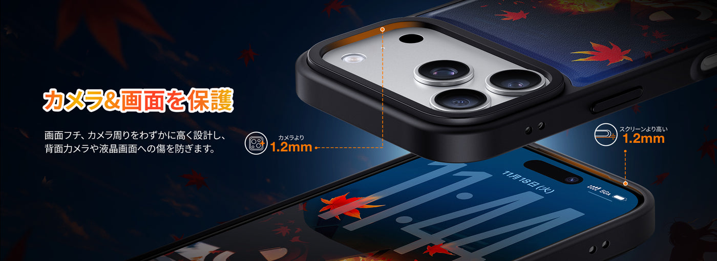- 【カメラレンズ・画面保護】ケースの縁は、スマホの液晶画面より1.2mm、カメラレンズより1.2mm高く設計されています。そのため、スマホを平らな場所に置いた場合に、画面やレンズが直接触れることがなく、擦れや傷付きを防ぐことができます。